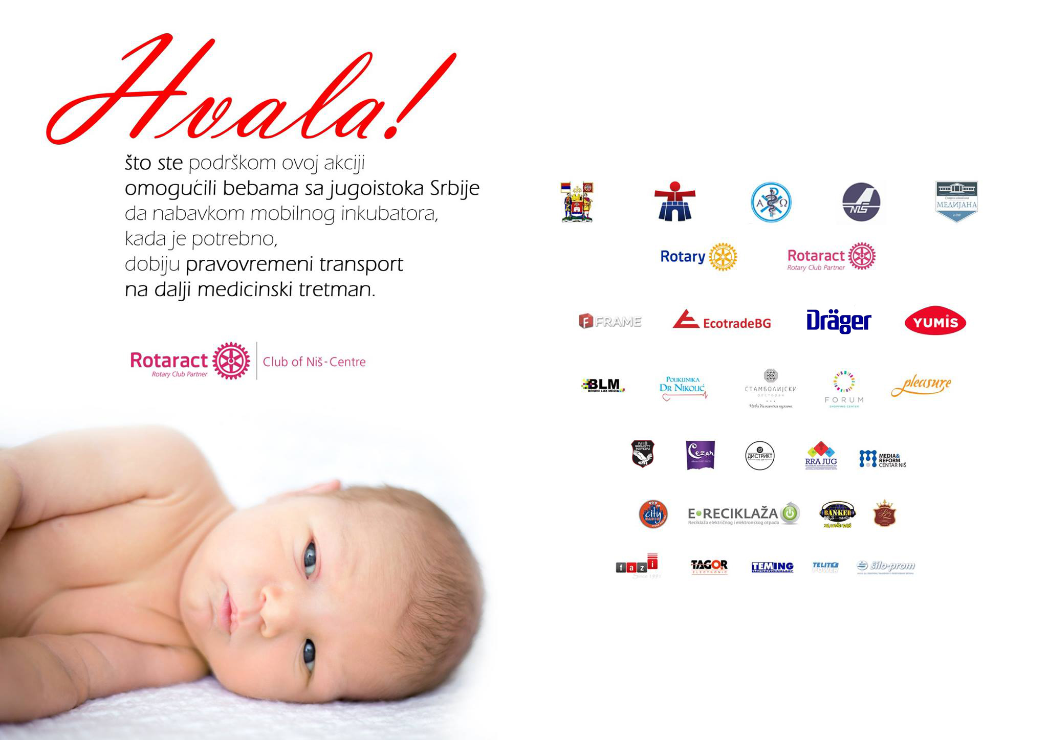 Humanitarna kampanja „Pobedi vreme!“ uspešno je realizovana u 31. januara 2018. godine, kada je izvršena primopredaja mobilnog inkubatora Kliničkom centru u Nišu. Ova donacija će Kliničkom centru omogućiti kapacitete da rešava sve kritične situacije kada postoji potreba za transport životno ugrožene bebe iz bilo kog mesta na jugoistoku Srbije ka Nišu ili iz Niša ka Beogradu na dalji medicinski tretman. Posebno smo ponosni na rezultate ove kampanje koja je u javnosti ukazala na problem nedostatka mobilnog inkubatora jer danas KC Niš, za samo godinu dana, ima 4 mobilna inkubatora.